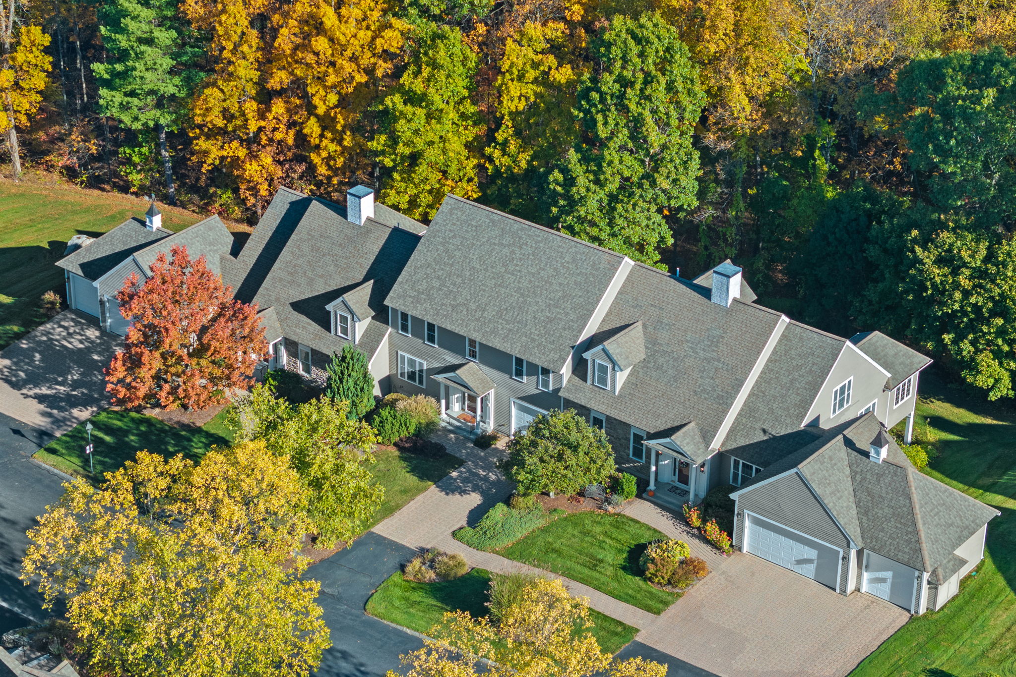 Welcome home to Caldwell Farm, an award-winning active adult community near beaches, commuter routes and downtown Newburyport. This meticulously maintained sun-filled Cromwell style Townhome with many updates features a first-floor primary suite, spacious open concept living room with gas fireplace, formal dining room, powder room, large kitchen with a bright breakfast area to enjoy your morning coffee, and a spacious entry foyer with a dramatic open staircase to the second floor. The oversized mahogany deck overlooking a private wooded setting can be accessed from the sliding doors leading out from both the living room and primary bedroom. On the second floor you'll find a second primary suite or guest bedroom with an electric fireplace, custom closets, full bath, and a spacious office boasting a wall of beautiful built-ins, as well as a large walk-in closet ideal for storage. You will absolutely enjoy the finished walk-out lower-level family room with wet bar, half bath, and access to a lovely, covered patio. This unit has 2 garages and additional parking available in driveway. A Must See!!